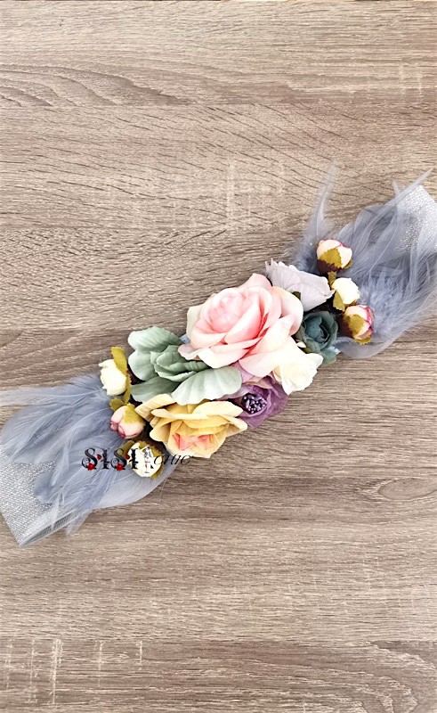 Cinturón Flores Plata Plumas Elástico Fiestas Bautizos Ceremonias SisiChic