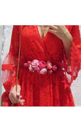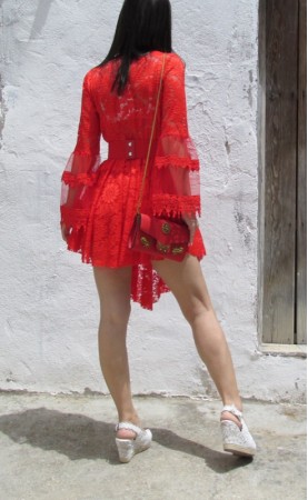 Mono de encaje cruzado en color rojo asimétrico por delante .