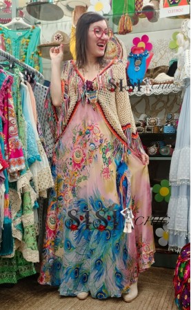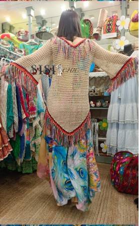 Chaqueta de crochet a mano en color beige con flecos multicolores